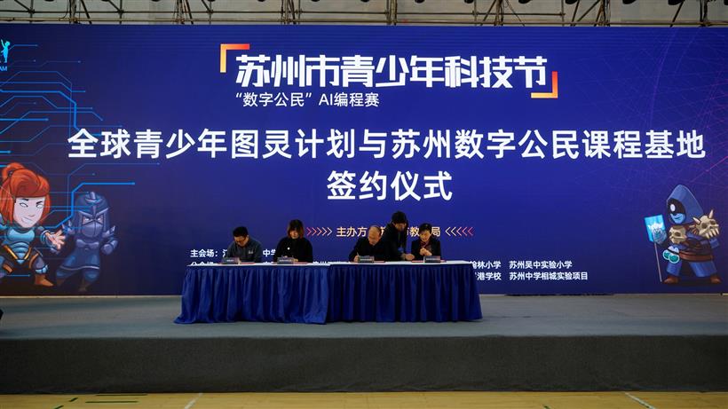 全球青少年图灵计划、扣哒世界、苏州中学园区校和苏州市沧浪教育集团签署战略合作协议,共同建设“数字公民”课程基地,培养优秀青少年进入图灵计划、AI世青赛、信息学竞赛和顶级名校青少年人工智能拓展训练项目。