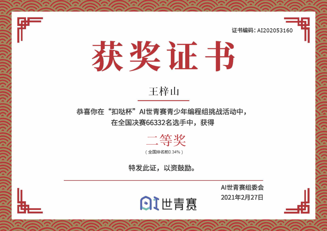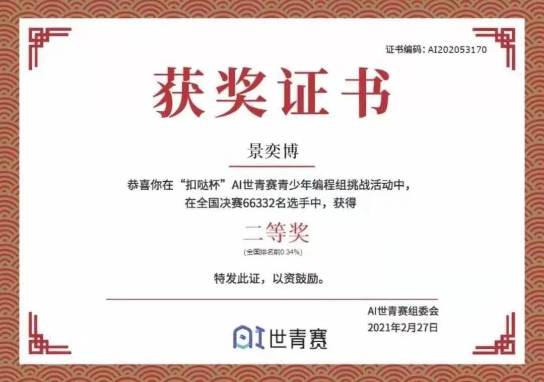 在参加了“数字公民”AI竞技场赛后,让我有了更大的动力学习编程。我想我应该可以更好,于是寒假中更加努力学习,坚持练习,最终以全国赛二等奖的成绩完美的画上了句号。 ——景奕博