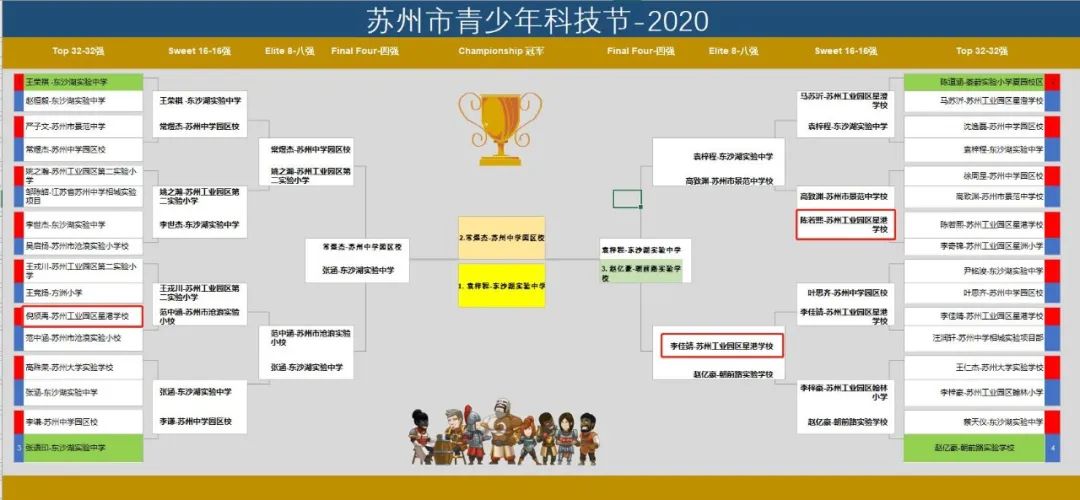 决赛在苏州中学园区校主会场和苏州工业园区星港学校等八个分会场 5G连线同时举行。上午的竞赛模式采用国际领先的扣哒世界算法竞技场模式,主会场线下160名选手中前20名优胜者与分会场线上复活赛中的12强,共同组成32强角逐冠亚季军。下午的角逐则采用了世界杯决赛的模式,经过抽签产生上下半场4个小组,32强选手通过系统抽签决定两两pk的对手,选手每15分钟优化一次代码,依次产生16强、8强、4强、冠亚季军。我校学子倪颀禹入围前32强,陈若熙入围前16强,李佳靖入围前8强。