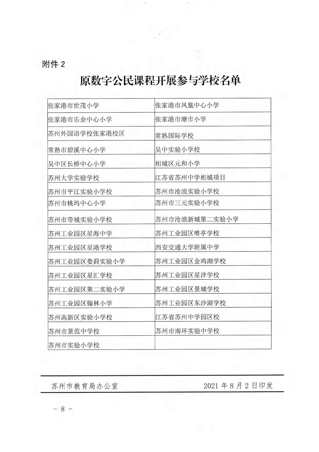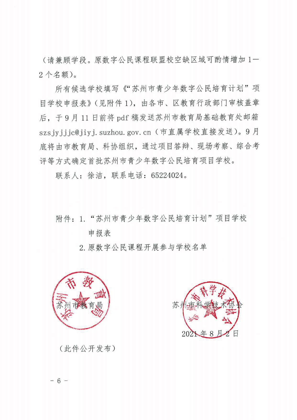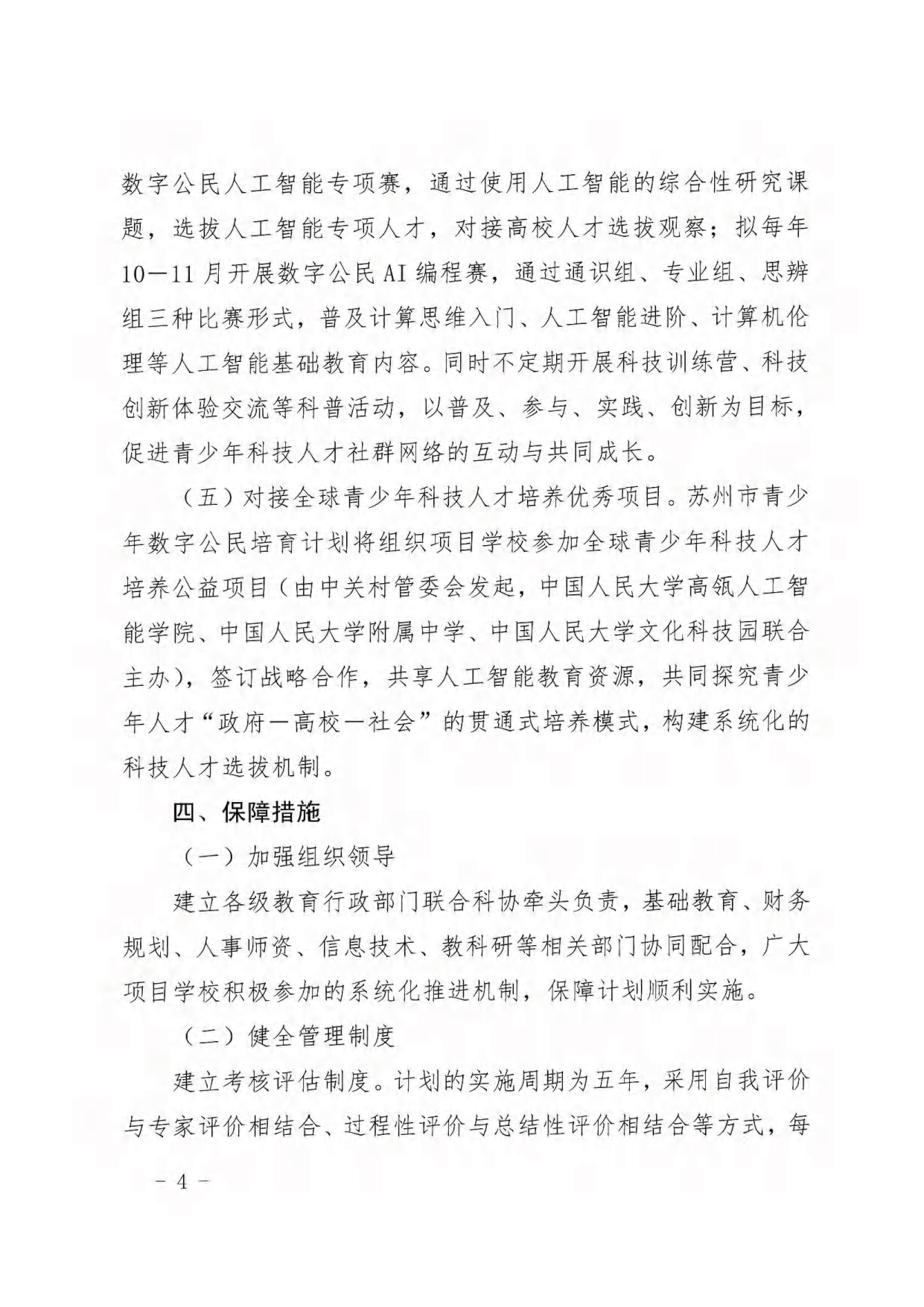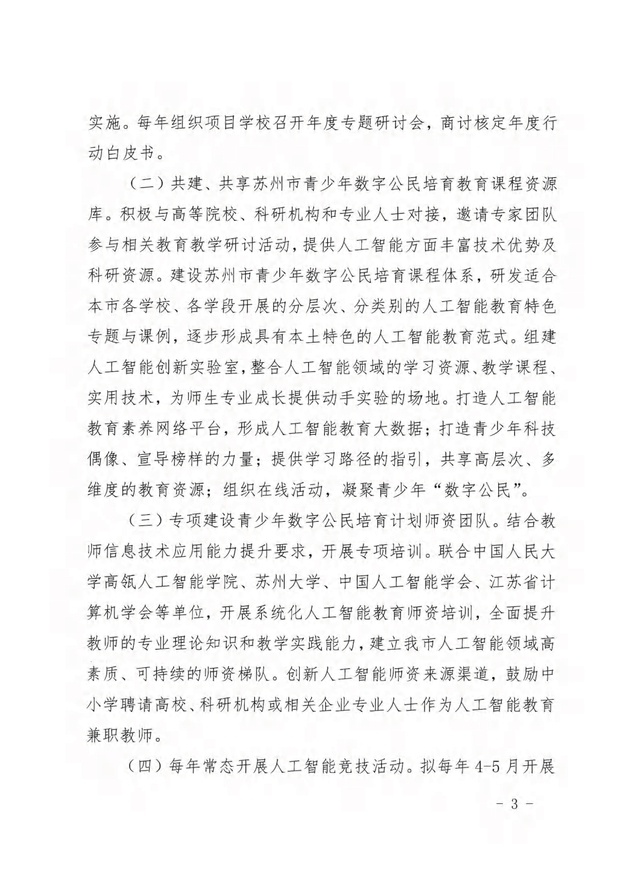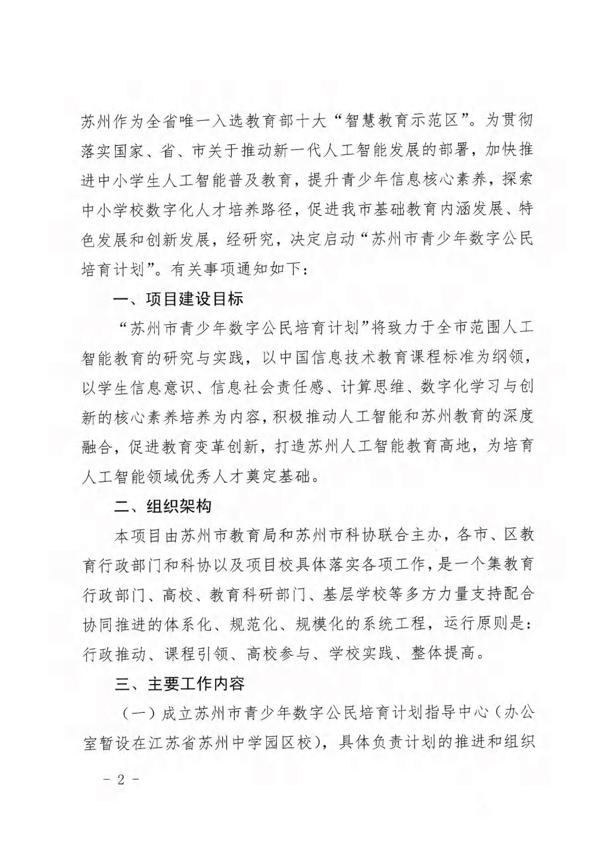 2021年8月2日,苏州市教育局和苏州市科学技术协会联合主办并正式启动“苏州市青少年数字公民培育计划”。项目致力于全市范围人工智能教育的研究与实践,以中国信息技术教育课程标准为纲领,以学生信息意识、信息社会责任感、计算思维、数字化学习与创新的核心素养培养为内容,积极推动人工智能和苏州教育的深度融合,促进教育变革创新,打造苏州人工智能教育高地,为培育人工智能领域优秀人才奠定基础。